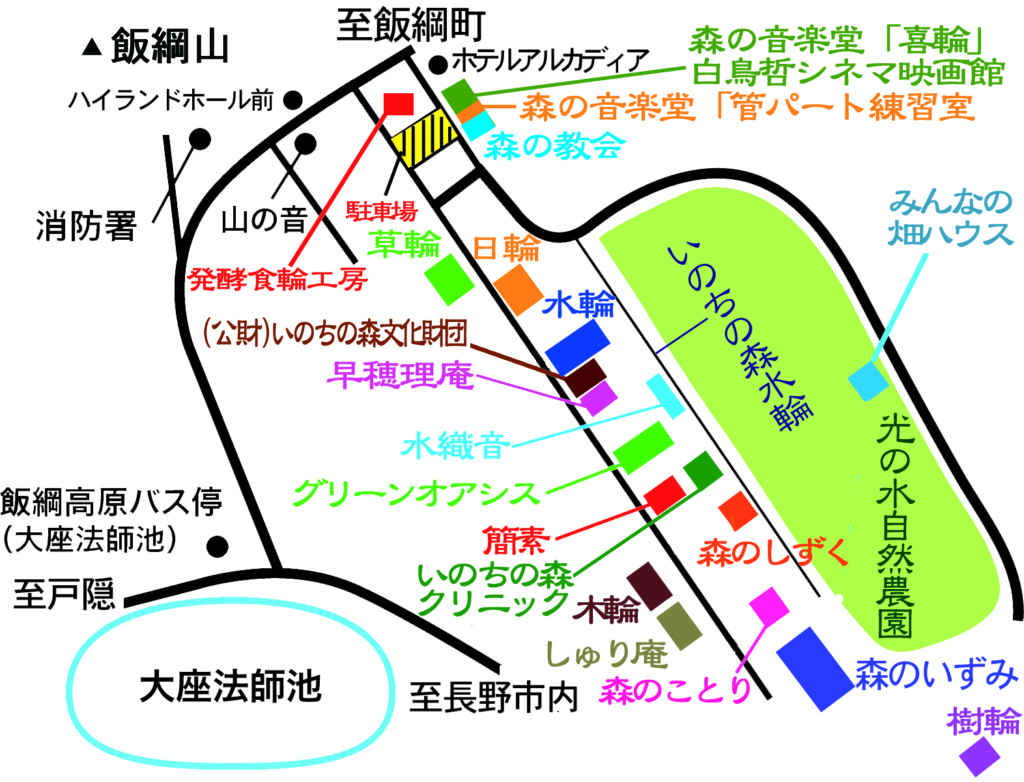 今現在4万8千坪(東京ドーム3個分)のいのちの森の中に、水輪ナチュラルファーム光の水自然農園と田んぼ10町歩、宿泊棟11棟、森のレストラン、森の音楽堂「喜輪」、森の教会、味噌醬油発酵食輪工房、森の菓子工房、フリースクール生き方働き方学校など、20棟が点在しています。