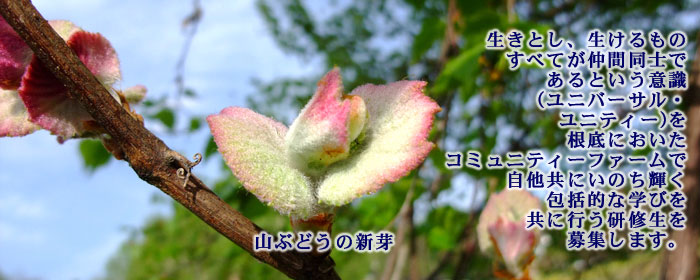 生きとし、生けるものすべてが仲間同士であるという意識(ユニバーサル・ユニティー)を根底においたコミュニティーファームで自他共にいのち輝く包括的な学びを共に行う研修生を募集します。